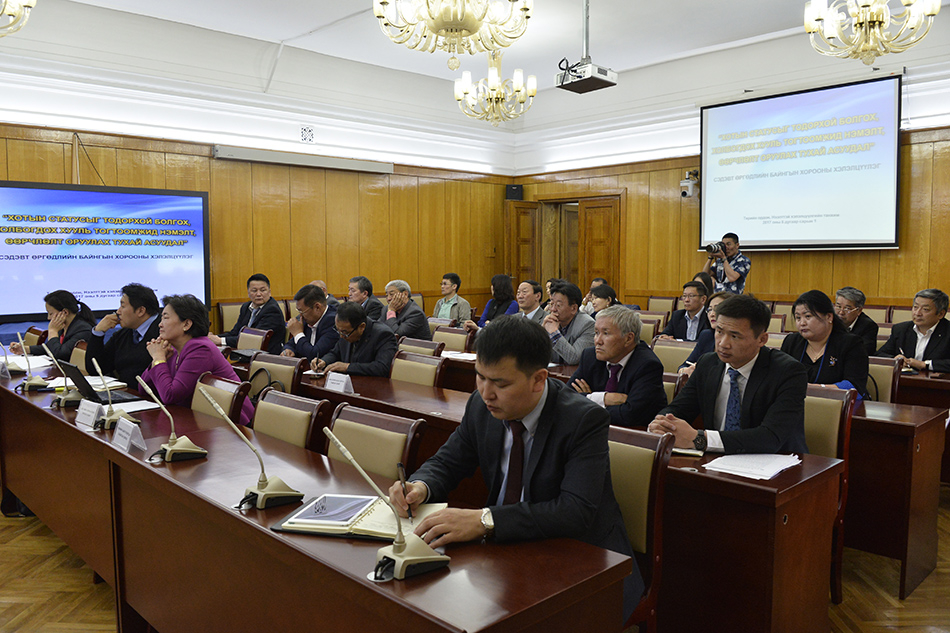 Дараа нь “Хотын статусыг бусад орны Үндсэн хуульд хэрхэн тусгасан талаарх” сэдвээр НҮБ-ын Хөгжлийн хөтөлбөрийн Засаглалын багийн ахлагч Ц. Даваадулам, “Хотын статусын талаарх одоогийн хууль, эрх зүйн зохицуулалт” сэдвээр МУИС-ийн Хууль зүйн сургуулийн дэд захирал А.Бямбажаргал нар танилцуулга хийв.