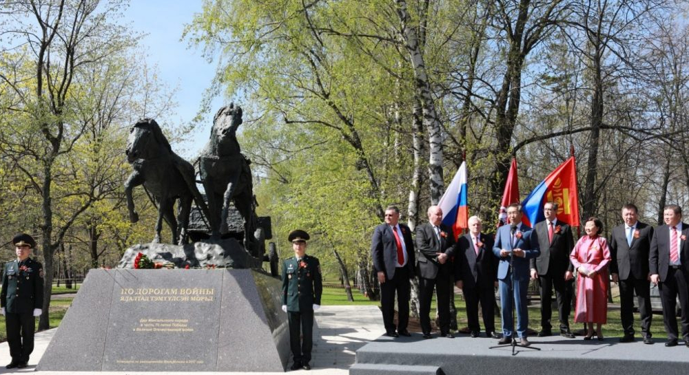 Аугаа Эх орны дайны Ялалтын 70 жилийн ойг тохиолдуулан бүтээсэн Монголын ард түмний бэлгийн “Ялалтад тэмүүлсэн морьд” хөшөөний нээлтийн ёслолын арга хэмжээ Москва хотын Хүндэтгэлийн дэнж дэх Ялалтын цэцэрлэгт хүрээлэнд энэ сарын 5-ны өдөр болов.