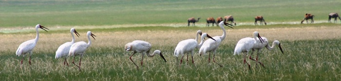 Grus Ieucogeranus: тогруутны багийн нэн ховор, дэлхийн хэмжээнд ховордсон зүйл. Бие том 120-140 см өндөр, дун цагаан зүстэй. Далавчны үзүүр хар, нүүр хошуу, хөл улаан. Эр нь эмээсээ арай том. Залуу тогоруу улаан туяатай, цагаан өдтэй.