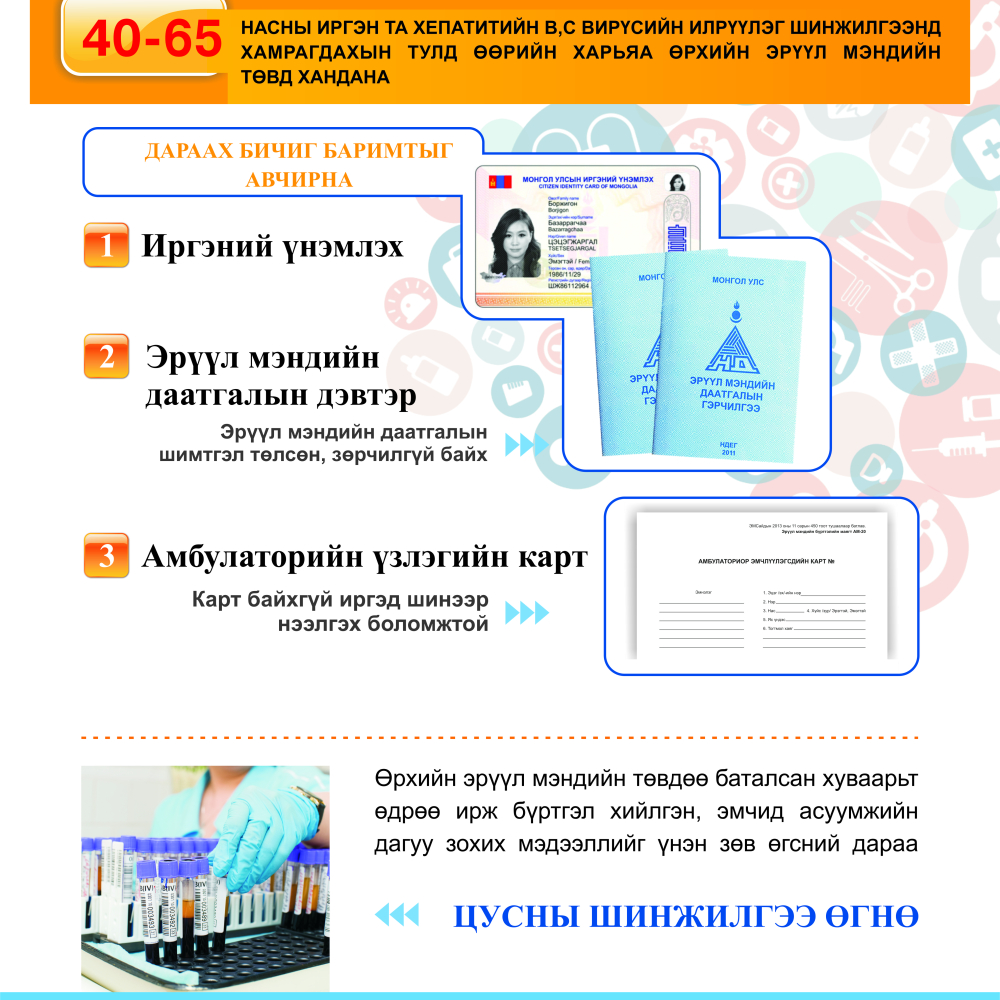 Иймд хепатитийн В, С вирүсийн илрүүлэг шинжилгээнд хамрагдах хүсэлтэй 40-65 насны иргэн та эрүүл мэндийн даатгалын 2016, 2017 оны шимтгэлийг бүрэн төлсөн байх шаардлагатайг юм.
