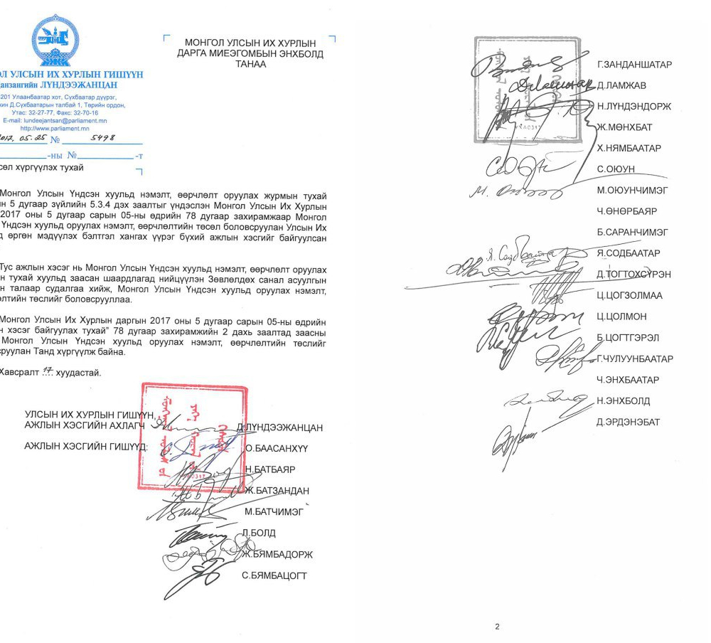 Монгол Улсын Үндсэн хуульд нэмэлт, өөрчлөлт оруулах асуудлаар явуулсан анхдугаар зөвлөлдөх санал асуулгын зөвлөмжийг үндэслэн Монгол Улсын Их Хурлын даргын 2017 оны 78 дугаар захирамжаар байгуулагдсан Ажлын хэсэг Монгол Улсын Үндсэн хуульд оруулах нэмэлт өөрчлөлтийн төслийг УИХ-д хүргүүлсэн. УИХ-ын гишүүн Д.Лүндээжанцангаар ахлуулсан, УИХ-ын гишүүн О.Баасанхүү, Ж.Батзандан, Л.Болд, С.Бямбацогт, Г.Занданшатар, Ж.Мөнхбат, Х.Нямбаатар, М.Оюунчимэг, Я.Содбаатар, Д.Тогтохсүрэн, Ц.Цогзолмаа, Н.Энхболд, Д.Эрдэнэбат, УИХ-ын гишүүн асан Н.Батбаяр, М.Батчимэг, Ж.Бямбадорж, С.Оюун, УБХ-ын гишүүн асан, Үндсэн хууль судлаач Д.Ламжав, академич, доктор Г.Чулуунбаатар, УИХ-ын Тамгын газрын ерөнхий нарийн бичгийн дарга Ц.Цолмон, Шүүхийн ерөнхий зөвлөлийн дарга Н.Лүндэндорж, МҮАН-ын дарга Б.Цогтгэрэл нарын бүрэлдэхүүнтэй.