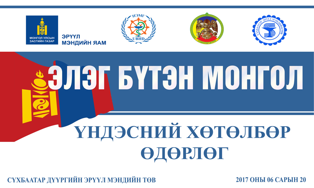 “Элэг бүтэн Монгол хөтөлбөр”-ийн нээлтийн үйл ажиллагааны өдөрлөг 2017 оны 06 дугаар сарын 20-ны өдөр 10:00-16:00 цагийн хооронд Цэрэндоржийн гудамжинд зохион байгуулагдах тул Сүхбаатар дүүргийн иргэд өргөнөөр хамрагдана уу.