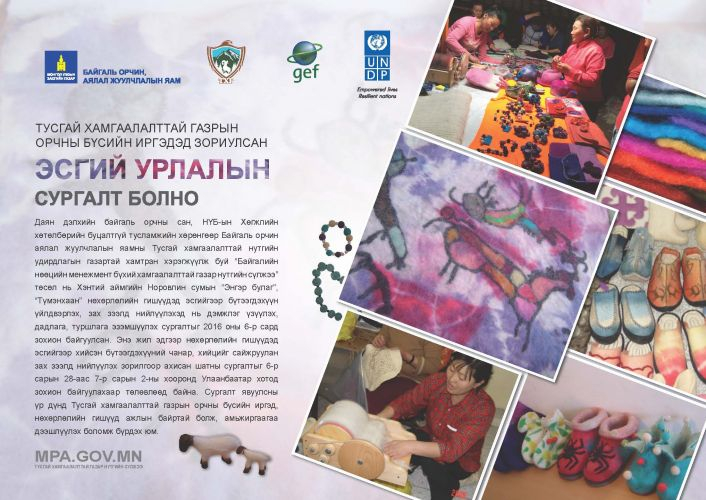 Даян дэлхийн байгаль орчны сан, НҮБ-ын Хөгжлийн хөтөлбөрийн буцалтгүй тусламжийн хөрөнгөөр Байгаль орчин, аялал жуулчлалын яамны Тусгай хамгаалалттай нутгийн удирдлагын газартай хамтран хэрэгжүүлж буй "Байгалийн нөөцийн менежмент бүхий хамгаалалттай газар нутгийн сүлжээ" төсөл нь Хэнтий аймгийн Норовлин сумын "Энгэр булаг", "Түмэнхаан" нөхөрлөлийн гишүүдэд эсгийгээр бүтээгдэхүүн үйлдвэрлэх, зах зээлд нийлүүлэхэд нь дэмжлэг үзүүлэх, дадлага, туршлага эзэмшүүлэх сургалтыг 2016 оны зургаадугаар сард зохион байгуулсан.