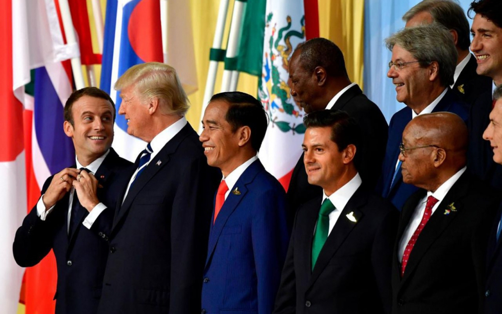 Францийн Le Pariesien сонинд бичсэнээр Эммануэл Макрон Их20-ийн удирдагчидтай зөрсөөр Доналд Трампын хажууд зогссон нь олон улсын протоколыг дагасан төдий. Макрон Энэтхэгийн ерөнхий сайд Нерендра Модигийн хажуугаар зөрөхдөө Норвегийн ерөнхий сайд Эрна Солдбергтэй мэндлээд амжсан байв.