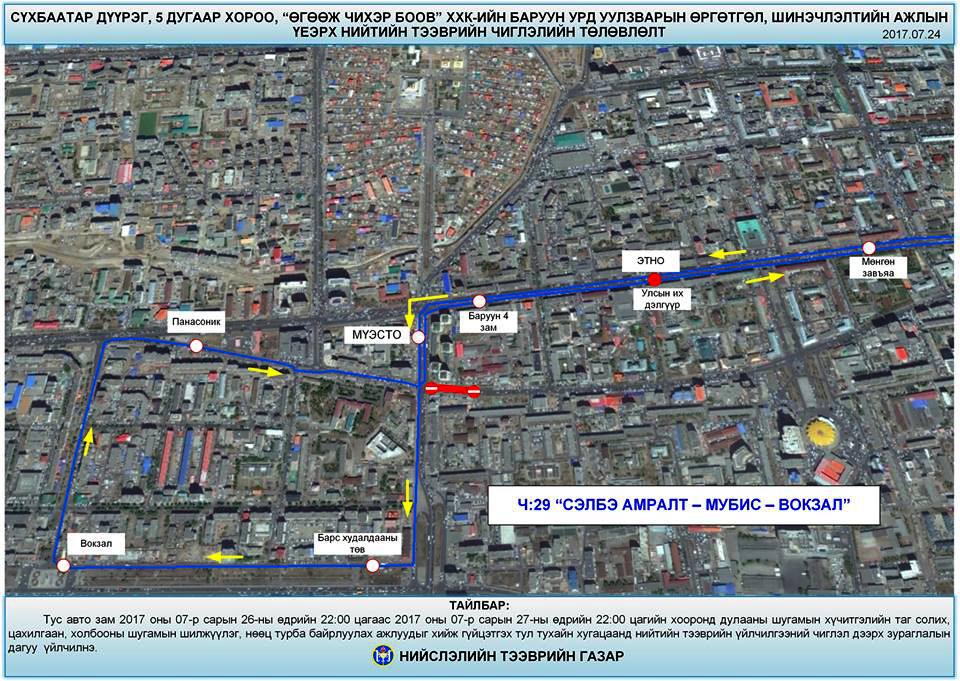 Зам хаагдахтай холбогдуулан нийтийн тээврийн үйлчилгээний Ч:29 “СЭЛБЭ АМРАЛТ-МУБИС-ВОКЗАЛ” чиглэлийн замналд түр хугацаанд өөрчлөлт орно. Чиглэлийн замналыг дараах зурагт харуулав гэж нийслэлийн Тээврийн газраас мэдээллээ.