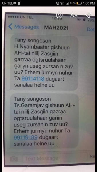 Уг мессэжид, Засгийн газрыг огцруулах үндэслэлд гарын үсэг зурсан гишүүдийн нэр, утасны дугаарыг хавсарган, “Таны сонгосон .... гишүүн АН-тай нийлж, Засгийн газраа огцруулахаар гарын үсэг зурсан нь үнэн үү. Эрхэм журмын нөхөр та .... дугаарт саналаа хэлнэ үү” гэжээ.