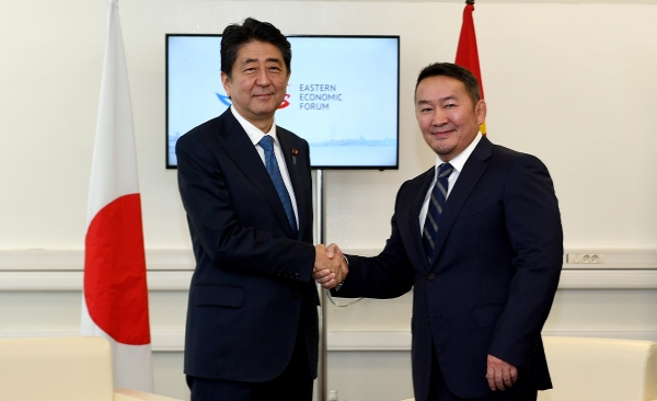 ОХУ-ын Владивосток хотод болж байгаа Дорнын эдийн засгийн форумд оролцож буй Монгол Улсын Ерөнхийлөгч Х.Баттулгад Япон Улсын Ерөнхий сайд Ш.Абэ өнөөдөр /2017.09.06/ бараалхав. Уулзалтад Монголын талаас Зам тээврийн хөгжлийн сайд Д.Ганбат, Монгол Улсын Ерөнхийлөгчийн Тамгын газрын дарга З.Энхболд, Гадаад харилцааны дэд сайд Б.Батцэцэг, Ерөнхийлөгчийн Монгол Улс, Япон Улсын хамтын ажиллагааны асуудал хариуцсан бие төлөөлөгч Д.Дагвадорж, Япон Улсын талаас Гадаад хэргийн сайд Т.Коно болон албаны бусад хүмүүс оролцлоо.