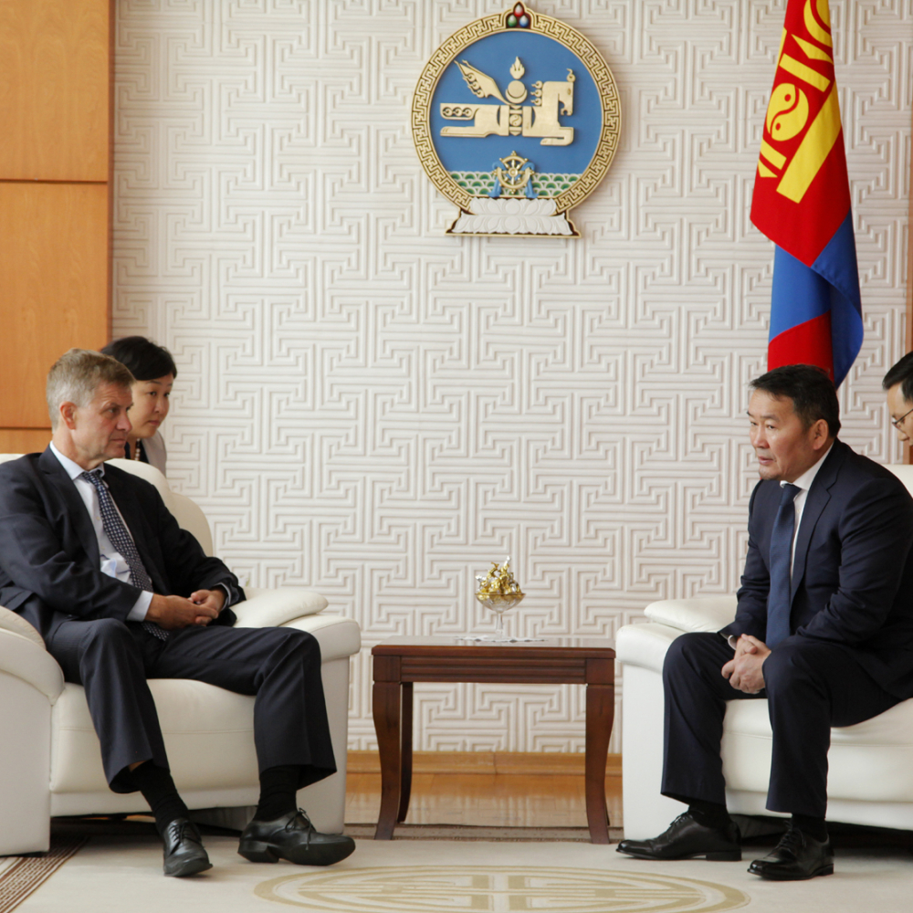 Монгол Улсын Ерөнхийлөгч Х.Баттулга Монгол Улсад албан ёсны айлчлал хийж байгаа НҮБ-ын Байгаль орчны хөтөлбөрийн гүйцэтгэх захирал Эрик Солхейм болон Монгол дахь суурин төлөөлөгч Б Транкман нарын төлөөлөгчдийг өнөөдөр хүлээн авч уулзлаа.