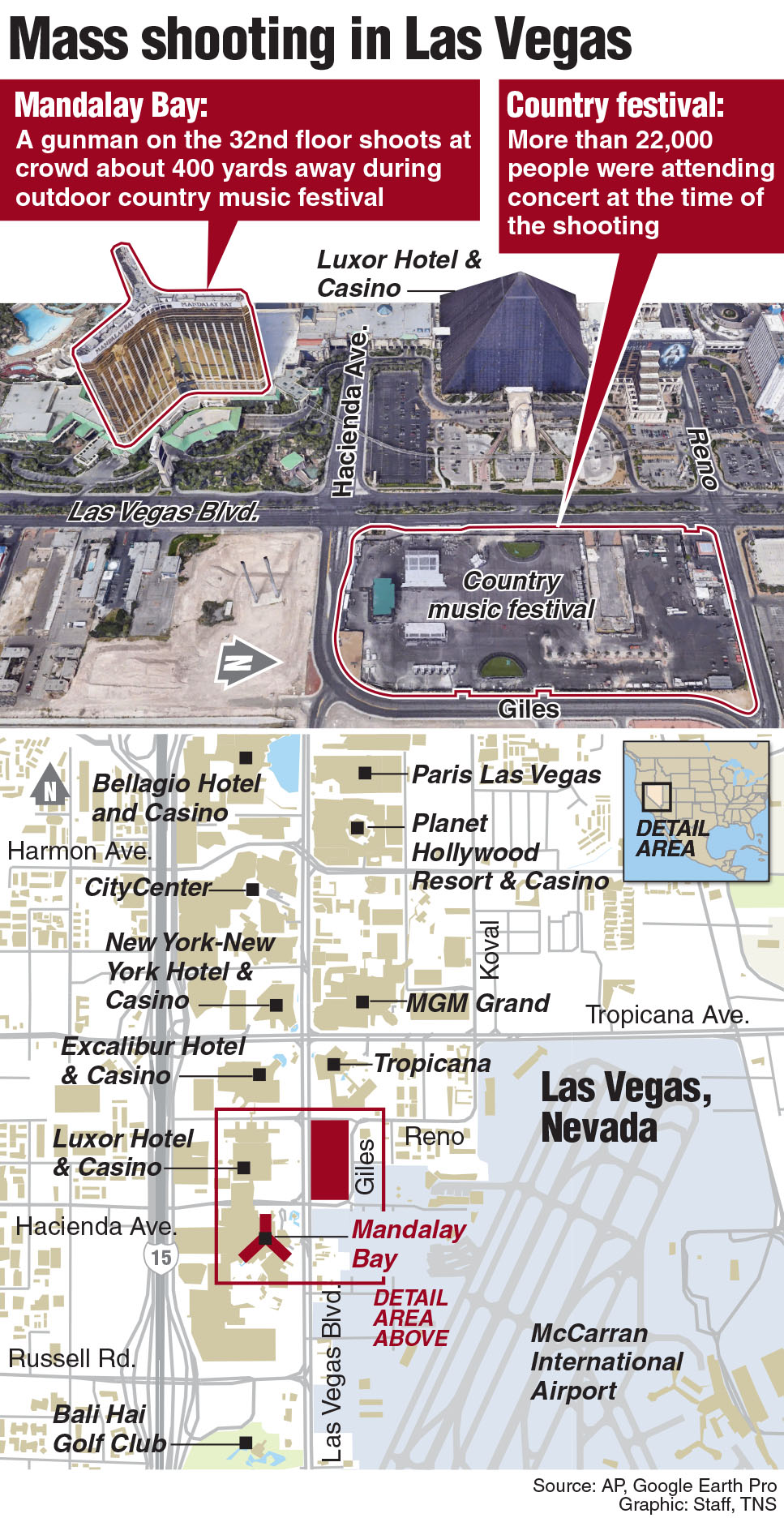 АНУ-ын Ерөнхийлөгч Доналд Трамп халдлагын улмаас амиа алдсан хүмүүсийн ар гэрийхэнд эмгэнэл илэрхийлсэн байна. Болсон хэрэг явдлыг товч дурдвал, орон нутгийн цагаар Ням гарагийн үдэш буюу шөнийн 10:00 цагийн үед энэ халдлага болсон бөгөөд гэмт этгээд тус казиногийн 32 давхраас ойролцоо талбайд болж байсан хөгжмийн наадамд оролцогчид руу гал нээжээ. Үүний улмаас хөгжмийн наадам үзэж сонирхохоор цугласан хүмүүс сандран, эмх замбараагүй байдал үүссэн байна. Цагдаа нар казиногийн барилга руу дайран орж, халдлага үйлдсэн этгээд болох 64 настай Стефан Паддокийг хэргийн газарт устгасан хэмээн тус мужийн Цагдаагийн газрын дарга Иосеф Ломбардо мэдэгдсэн юм.