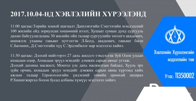 11.00 цагт Хүний нөөцийн судалгааны үндэсний хүрээлэн, “HR” клубээс хамтран зохион байгуулах “Үндэсний баялаг-Хүний нөөц” уриатай “HR Day-2017” арга хэмжээний талаар мэдээлэл хийнэ.