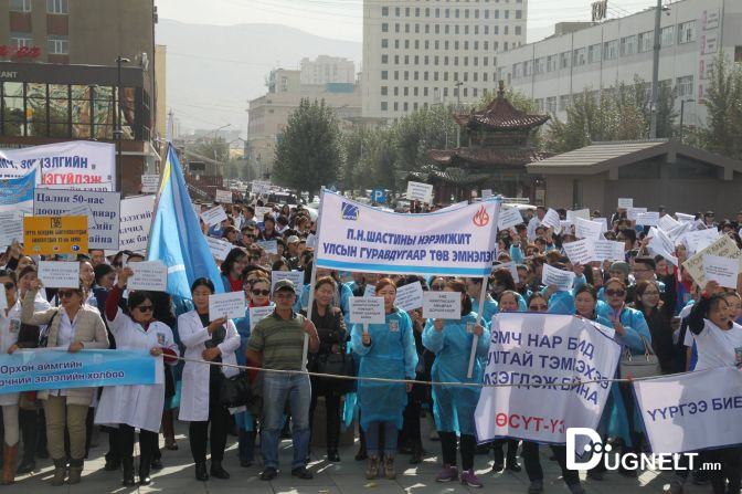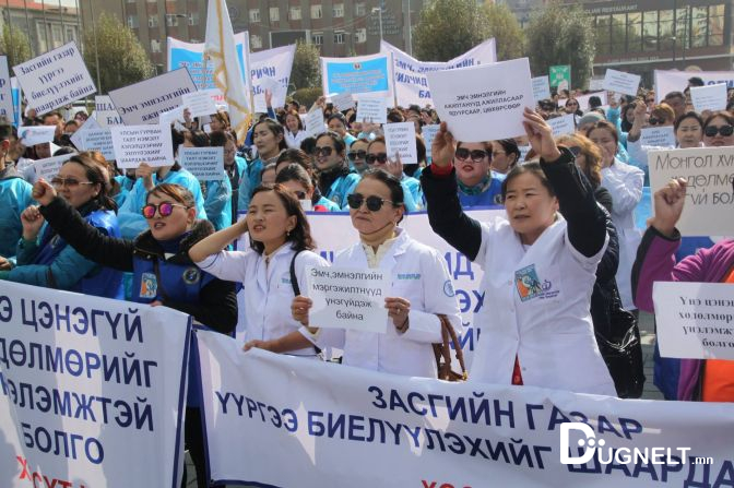 Эрүүл мэндийн салбарынханд Эрх чөлөөний талбайд өнөөдөр тайван жагсаал хийлээ. Өнөөдөр эрүүл мэндийн салбарынхан 2-3 дахин давсан ачаалалтай ажиллаж байгаа хэдий ч 434-660 мянган төгрөгийн цалин авч байгаа юм. Эрүүл мэндийн ажилтны ҮЭ-ийн холбооноос УИХ, Засгийн газарт цалинг нэмэгдүүлэх талаар удаа дараа шаардлага тавьж байгаа хэдий ч өнөөдрийг хүртэл тодорхой үр дүн гараагүй байна. '