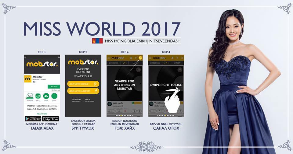 Дэлхийн мисс 2017-д эх орноо төлөөлөн оролцох Ц.Энхжинг Miss World-ийн үндсэн таван шалгуурын нэг болох Multimedia Awards дэмжээрэй. Мөн доорх линкнээс app-аа татаж аваарай.