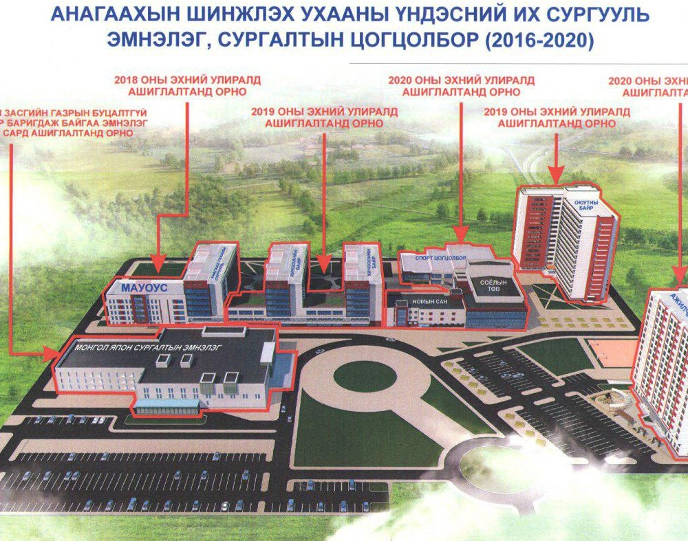 Мэдээлэлдээ, “Манай хамт олон Монгол Улсад анх удаа Их сургуулийн Эмнэлэг, сургалтын цогцолбор байгуулах төслийг 2016 оноос хэрэгжүүлж эхэлсэн бөгөөд тус цогцолборт Сургалтын эмнэлэг, Анагаах ухааны сургууль, Монгол Анагаах ухааны олон улсын сургуулийн хичээлийн байр, Уламжлалтын эмнэлэг, Хичээлийн 4 байр, Оюутны соёлын төв, спорт цогцолбор, 1200 оюутны байр, Багш, ажилчдын орон сууц багтаж байна. Сургалтын эмнэлэг 2018 оны долдугаар сард ашиглалтад орохоор төлөвлөгдсөн. Цогцолбороор нь 2020 оны эхний улиралд ашиглалтад оруулах юм. Энэ төсөлд нийт 234.8 тэрбум төгрөг шаардлагатайгаас 176.7 тэрбум нь Япон Улсын Засгийн газрын буцалтгүй тусламжаар шийдэгдсэн. Тодорхой хувийг эмнэлэг өөрийн төсвөөс бүрдүүлж байгаа бол улсын төсвөөс Сургалтын эмнэлгийн үйл ажиллагааг эхлүүлэх гарааны хөрөнгө оруулалт болох 16.9 тэрбум, Сургалтын эмнэлгийн барилгад шаардагдах 14.3 тэрбум төгрөг гаргахаар шийдвэрлэсэн. Япон Улсын Засгийн газартай байгуулсан Цогцолборыг хүлээн авч байгаа орны Засгийн газар 10 хувийн санхүүжилтыг гаргах гэрээний заалтын дагуу улсын төсвөөс шаардлагатай санхүүжилт гарах юм” гэв.