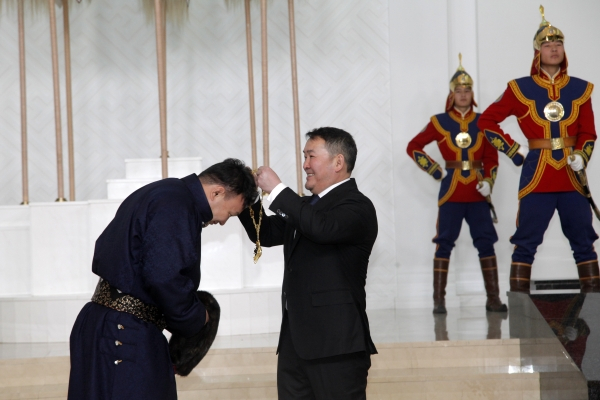 Өнөөдөр болсон төрийн дээд шагнал-тэргүүн зэргийн одон “Чингис хаан” одонгоор шагнах ёслолд Монгол Улсын Ерөнхийлөгч Х.Баттулга, УИХ-ын дарга М.Энхболд, Ерөнхий сайд У.Хүрэлсүх нар, өмнө нь уг одонг гардан авсан эрхмүүд, төр, нийгэм, цэргийн зүтгэлтнүүд хүрэлцэн ирж, Төрийн ордны Баганат танхимд зочдыг угтах улаан хивсний ёслолд оролцоод Төрийн ёслол хүндэтгэлийн их танхимд морилцгоов. Ёслолын арга хэмжээний үеэр Монгол Улсын Консерваторийн оюутнууд Монгол Улсын Урлагийн гавьяат зүтгэлтэн Ч.Чинбатын удирдлага дор Монгол Улсын Төрийн дуулал, “Халуун элгэн нутаг", “Монголын тал нутаг“дуугаар ая дууны эгшгэн мялаалга өргөлөө.