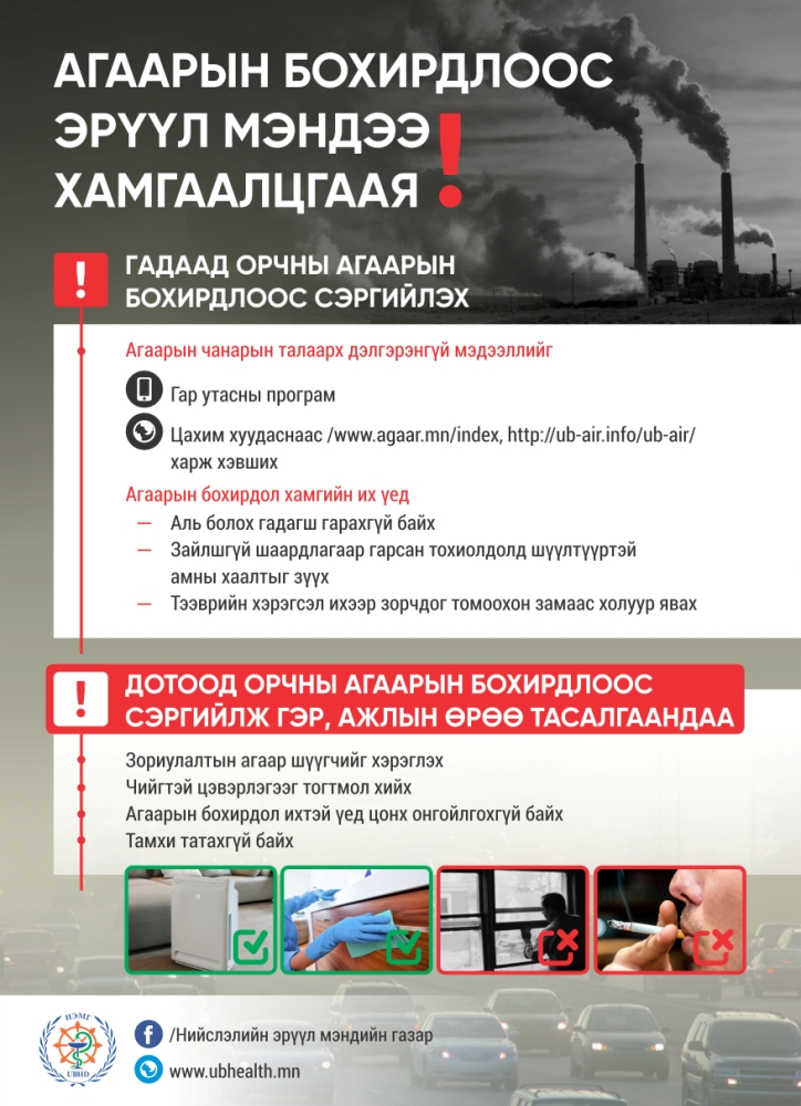 Агаарын бохирдолтой холбоотой өвчлөлөөс урьдчилан сэргийлж, эрүүл мэндээ хамгаалахын тулд ард иргэд өдөр тутмынхаа амьдралд ямар дадлыг хэвшүүлэх талаар Нийслэлийн эрүүл мэндийн газраас гаргасан зөвлөмжийг хүргэж байна.