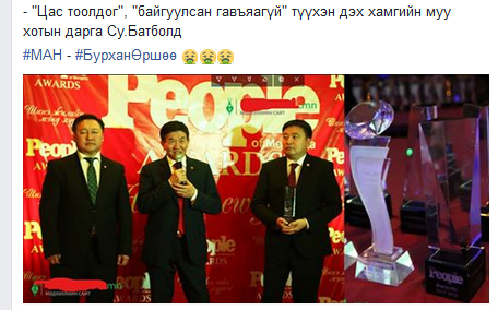 “People” сэтгүүлээс 2017 оны шилдгүүдийг шалгаруулах “People awards” гэх ёслолыг хийсэн юм. Тус ёслолын ажиллагаанаас салбартаа хийж бүтээсэн ажилтай, олныхоо төлөө зүтгэсэн олон эрхэм шилдгээр шалгарсан. Зарим нь ч дарга нарт зориулсан шагналууд байв хэмээн үнэлж, дүгнэх олон хүн байсныг нуух юун. Үүний нэг жишээ нь, “Оны шийдэл сайтай, хариуцлагатай улстөрч”-өөр Нийслэлийн Захирагч бөгөөд Улаанбаатар хотын Засаг дарга Су.Батболд тодорчээ. Түүнийг ажлаа авсан цагаасаа эхлэн нийслэлд маш олон санал, санаачилга гарган нийслэлчүүдийн талархалыг хүлээсэн түшээ хэмээн үнэлж.