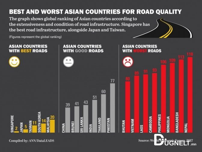 Харамсалтай нь энэ үнэлгээгээр Монгол улс Бангладеш, Балба хоёрыг ардаа орхиж, сүүлээсээ гуравт жагссан байна. Харин дэлхийн нийт улсуудын дотор замын чанараар 109 дүгээрт жагсжээ.