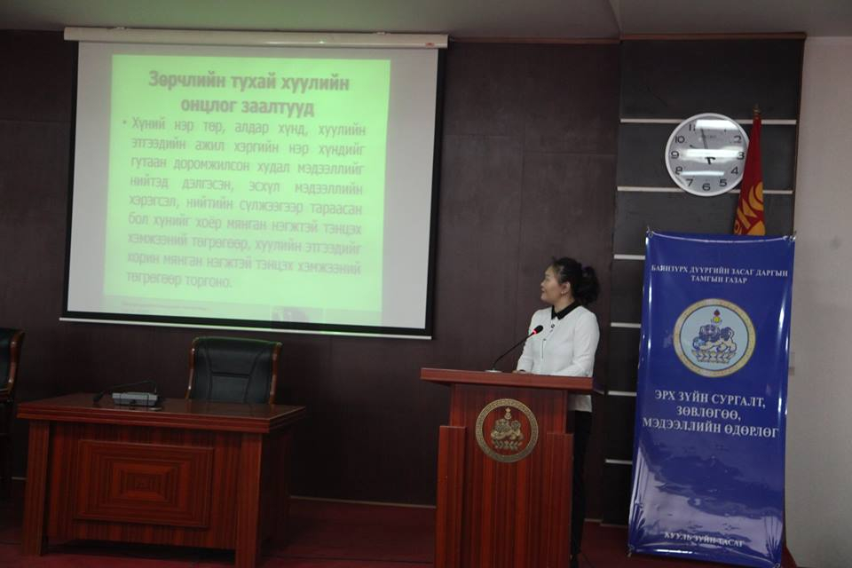 Баянзүрх дүүргийн Засаг даргын Тамгын газрын Хууль зүйн тасгаас эрх зүйн сургалт, сурталчилгаа, зөвлөгөө, мэдээллийн өдөрлөгийг амжилттай зохион байгууллаа. Энэхүү өдөрлөгийг ‘’Иргэдийн оролцоотой-Амьдрах орчноо сайжруулах жил’’-ийн хүрээнд болон 2018 оны эрх зүйн сургалт, сурталчилгааны нэгдсэн төлөвлөгөөний дагуу зохион байгуулсан юм. Тухайлбал дүүргийн Тамгын газраас 28 хороог 4 бүсэд хуваан эрх зүйн сургалтыг зохион байгуулахаар төлөвлөсөн. Үүний дагуу өнөөдөр 1 дүгээр бүс буюу 1,2,3,4,7,21,27 дугаар хорооны зохион байгуулагч, хэсгийн ахлагчид сургалтад хамрагдлаа.