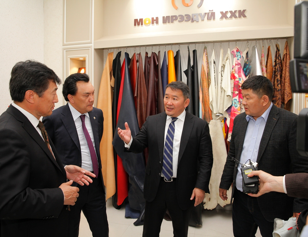 Монгол Улсын Ерөнхийлөгч Х.Баттулга эхлээд “Мон-Ирээдүй” ХХК-ийн үйлдвэрийн байраар орж, эцсийн бүтээгдэхүүн болоод бүтээгдэхүүн үйлдвэрлэх явцыг үзэв. Үйлдвэрийн захирал А.Ганбилэгийн танилцуулснаар үйлдвэр нь арьс ширний салбарт олгосон зээлийн үр өгөөжөөр дотоодын цэрэг, цагдаагийн хувцас, гутал үйлдвэрлэж байгаа юм байна. Мөн ямааны арьсаар гутлын дотор, бээлий, хувцасны бэлэн савхи, үхэр сарлагийн арьсаар эмээлийн гөлөм зэргийг боловсруулан нийлүүлдэг байна.