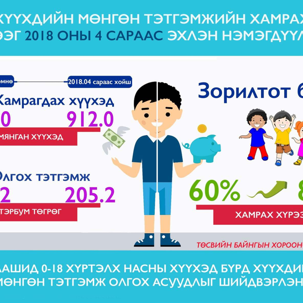 Нийгмийн халамжийн тухай хуульд заасан босго шугамын харгалзах оноог шинэчлэн 80 хувийн хамрах хүрээг тогтоох юм. Дээрх 80 хувьд хамрагдах, 2018 онд шинээр төрсөн хүүхэд хүүхдийн мөнгөн тэтгэмжээ авах хүсэлтээ гаргасны үндсэн дээр мөнгөн тэтгэмжээ авна. Цаашид хамрах хүрээг 80 хувиас бууруулахгүйгээр тооцож хүүхдийн мөнгөн тэтгэмжийг олгох эх үүсвэрийг 2019 оноос эхлэн жил бүр улсын төсөвт тусгахаар боллоо.