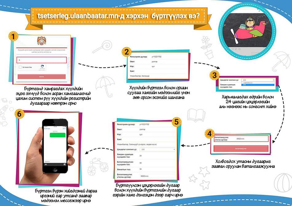Иргэд хүүхдээ цэцэрлэгт шинээр хамруулах гэж байгаа бол http://tsetserleg.ulaanbaatar.mn/register хаягаар бүртгүүлэх боломжтой. Уг вэб рүү ороод хүүхдийнхээ регистерийн дугаарыг хийхэд аль дүүргийн хэддүгээр цэцэрлэгт хамрагдах боломжтой талаарх мэдээлэл гарч ирэх аж. Улмаар эцэг, эхийн гар утсанд бүртгэлийн тусгай дугаар ирэх иргэнд очно.
