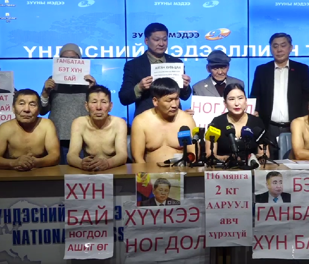 Эрдэнэс Тавантолгой ХК-ийн 1072 хувьцааны ногдол ашгийг шаардсан иргэд “нүцгэн” акц зохион байгуулж, мэдээлэл хийлээ.