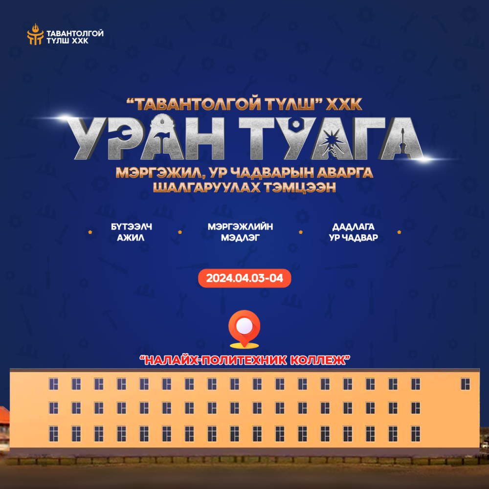 Тавантолгой түлш компанийн ажилчдын дунд зохион байгуулах “Уран тулга” мэргэжил, ур чадварын тэмцээн 2024 оны дөрөвдүгээр сарын 3-4нд Налайхын Политехникийн коллежид болно. Компанийн гагнуурчин, засварчин, цахилгаанчдын мэргэжлийн мэдлэг, ур чадварын түвшинг сорих, дээшлүүлэх, цехүүдийн ажлын уялдаа холбоог сайжруулах, багаар ажиллах чадварыг нэмэгдүүлэх, тэдний бүтээлч байдлыг дэмжиж ажил хэрэгч санаачлагыг өрнүүлэх, харилцан туршлага судлуулахад энэхүү тэмцээний зорилго оршиж байгаа юм.